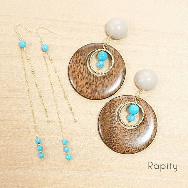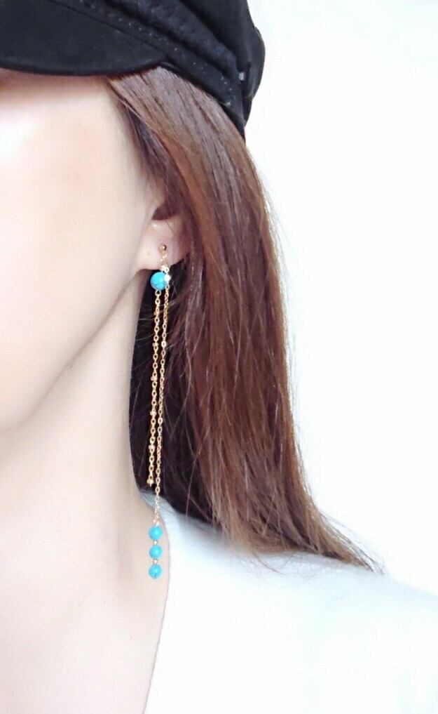 14kgf☆ 天然石ターコイズ 2連チェーンピアス