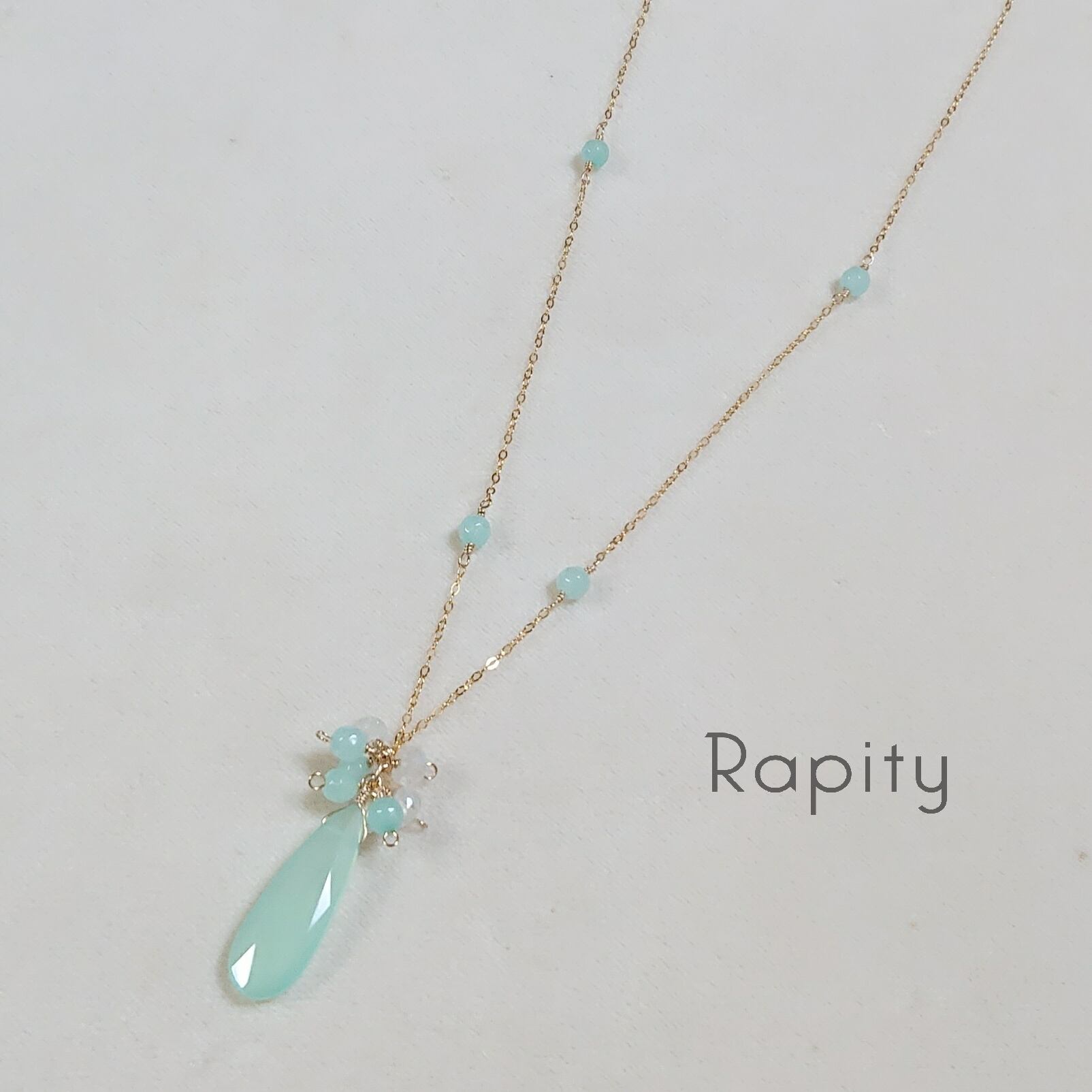 雫型の天然石ブルーカルセドニーをメインにボタン型の天然石ブルームーンストーンと4mmの天然石ブルーカルセドニーをミックスしたネックレスです。