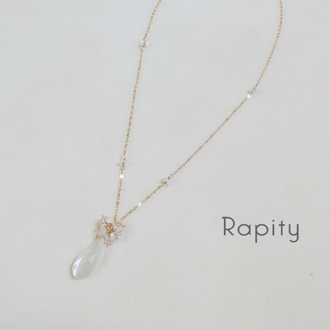 雫型の天然石ムーンストーンをメインにボタン型の天然石クォーツをミックスしたネックレスです。