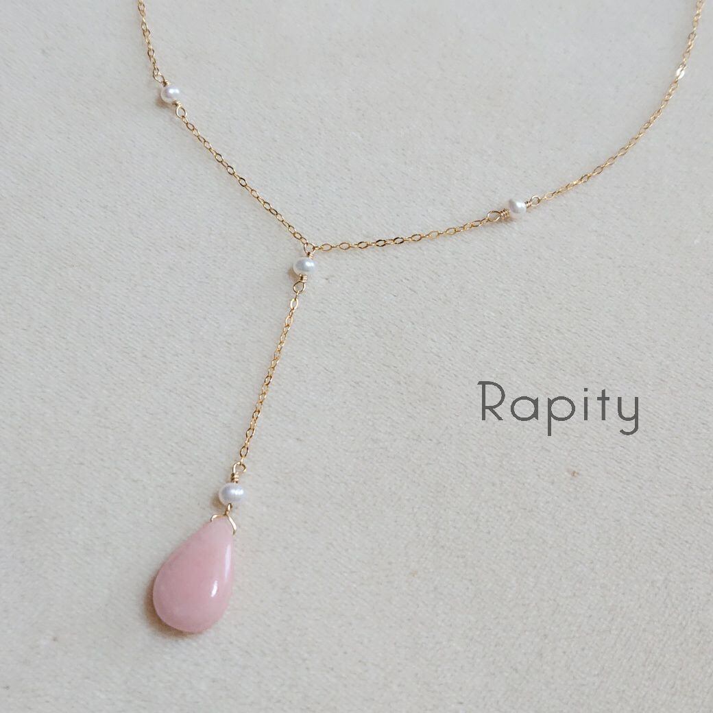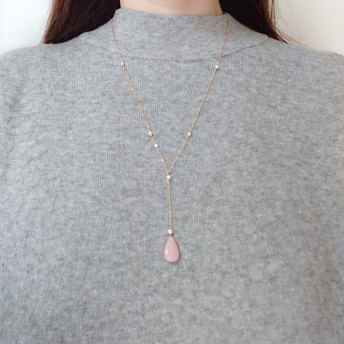 ドロップ型の天然石ピンクオパールに淡水パールを合わせたY字ロングネックレスです。