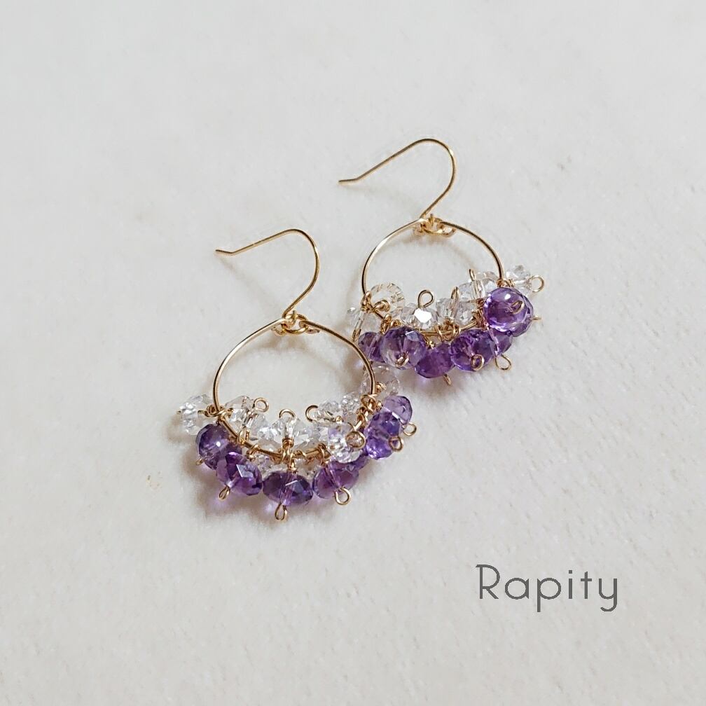 天然石アメジストと天然石クォーツをミックスしたとても上品で贅沢なフープピアスです。