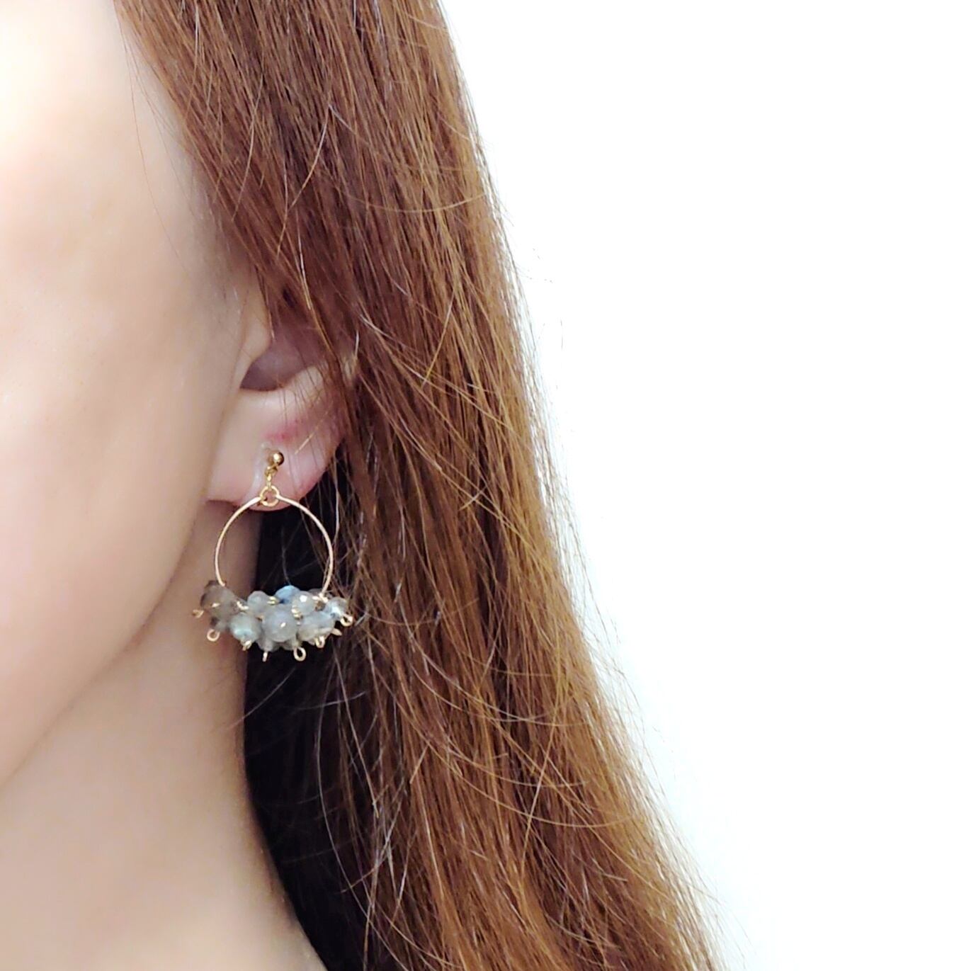 小ぶりなフープピアスですが、天然石がボリュームいっぱいでとてもゴージャスです♪