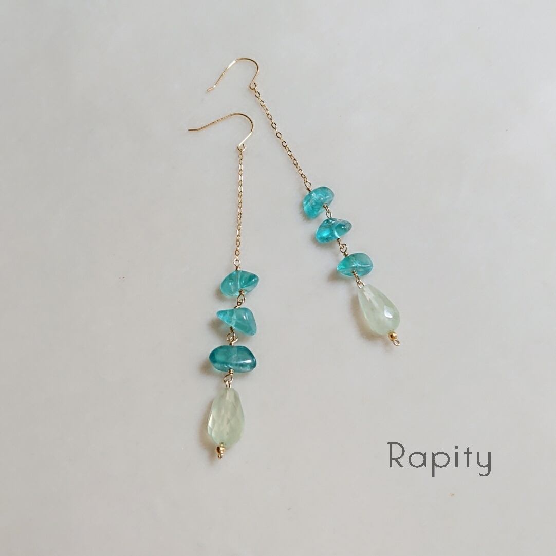 タンブルカットの天然石スカイブルーアパタイトとプレナイトのロングピアスです。