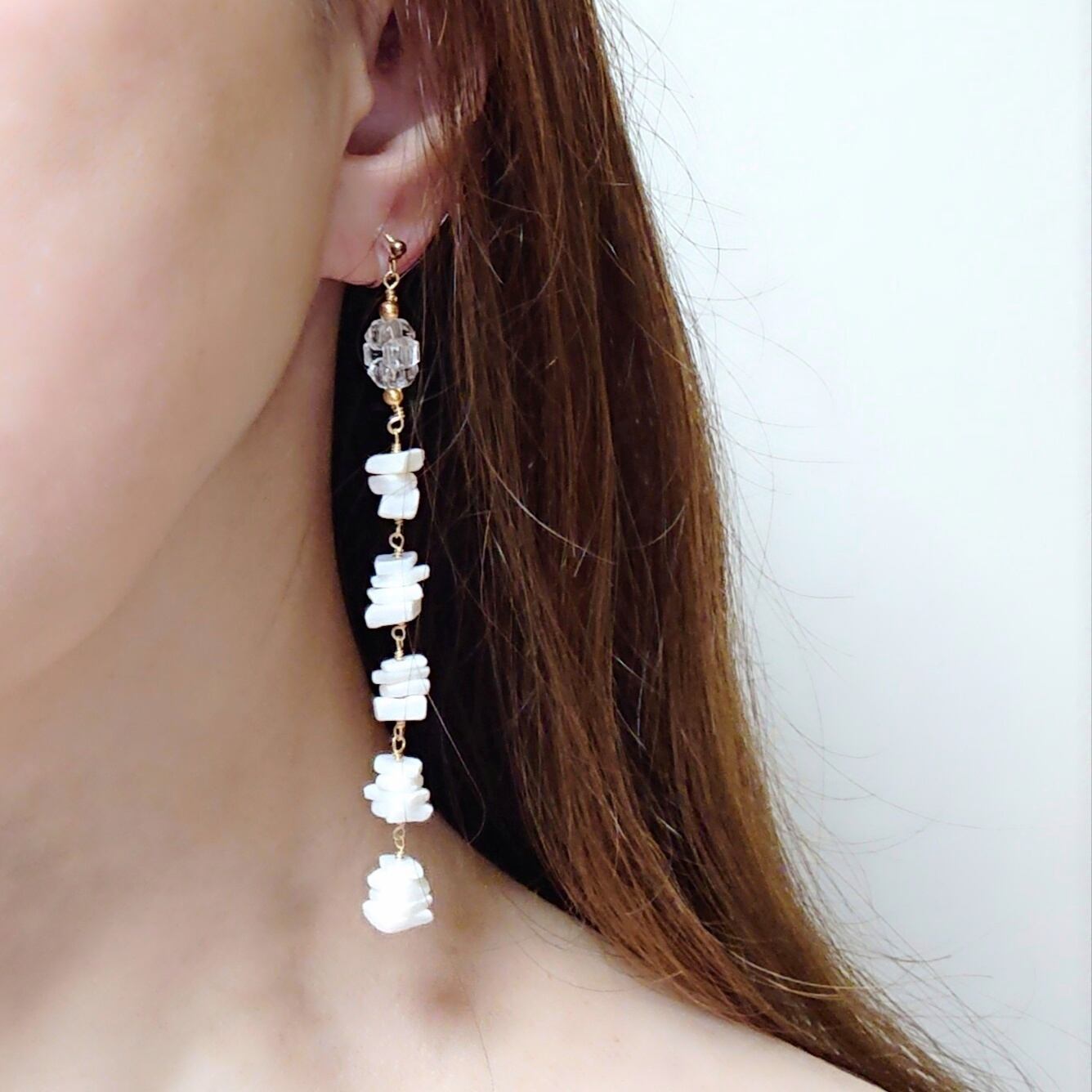 天然ホワイトシェルのさざれにフラワー型のクリアパーツを合わせたロングピアスです。