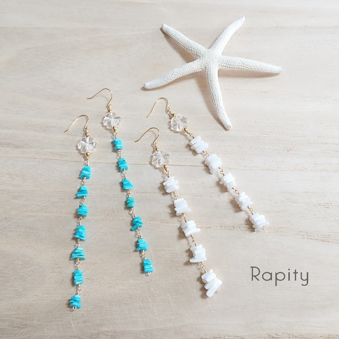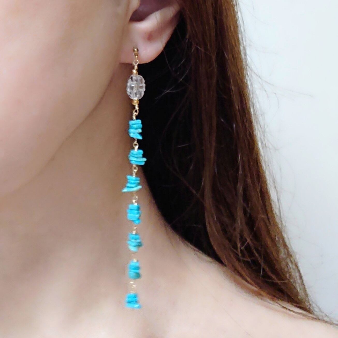 天然石ターコイズの小さめさざれにフラワー型のクリアパーツを合わせたロングピアスです。