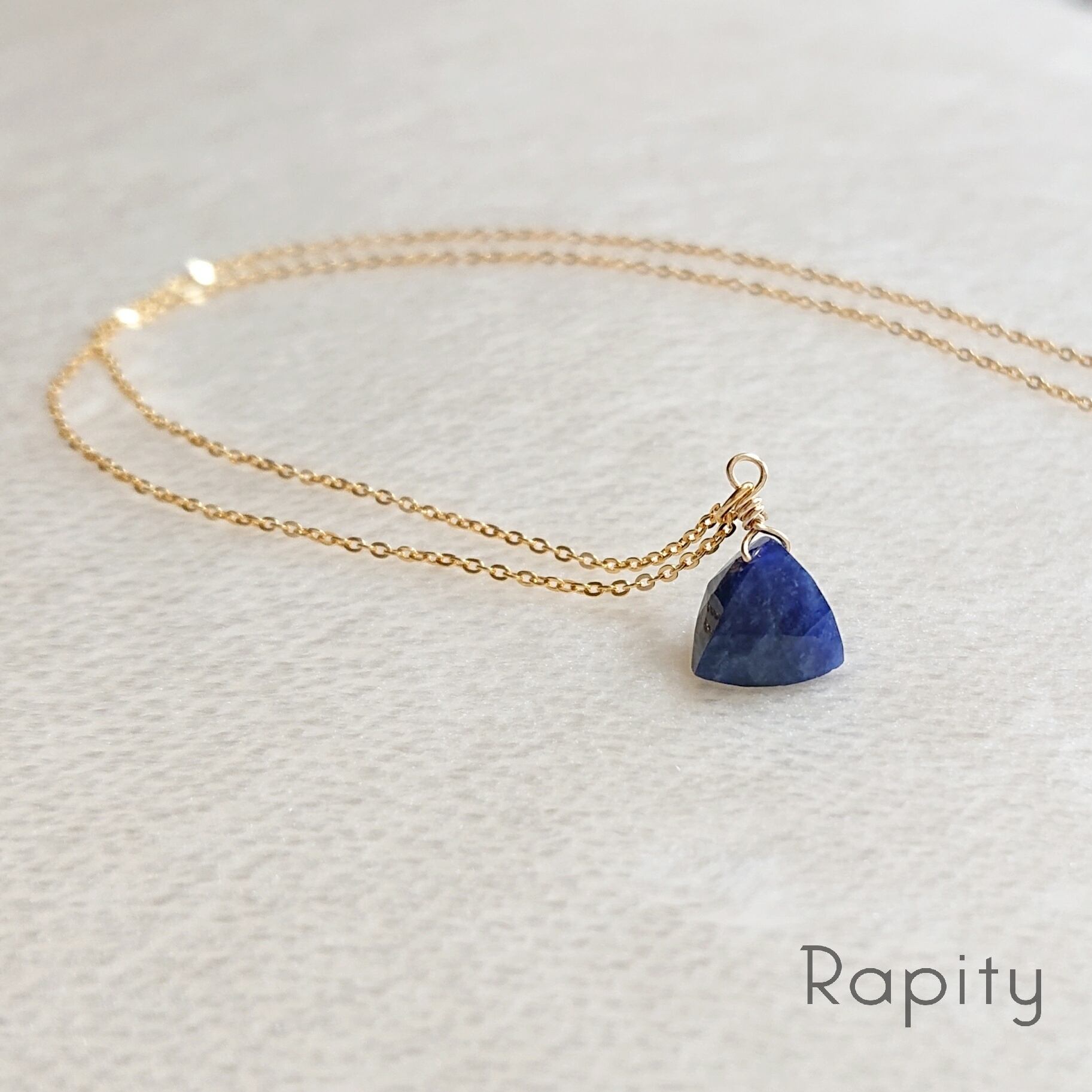 深みのある青色のソーダーライトのトリリアンカットされたネックレスです。
