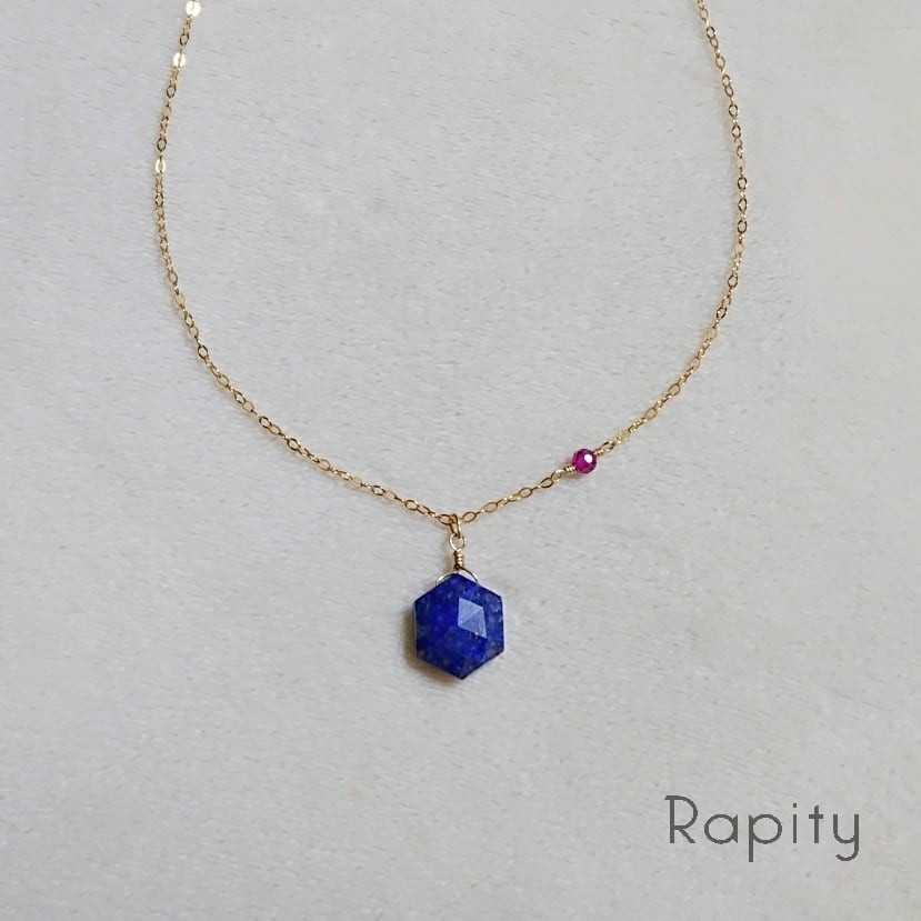 ヘキサゴン型のラピスラズリにアクセントとしてルビーを合わせたネックレスです。