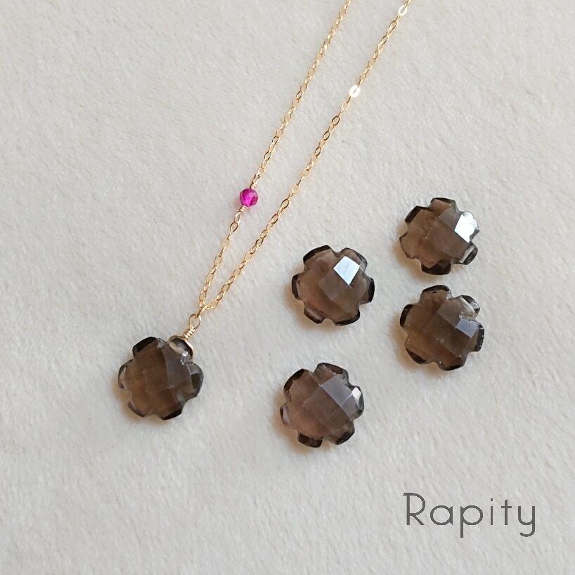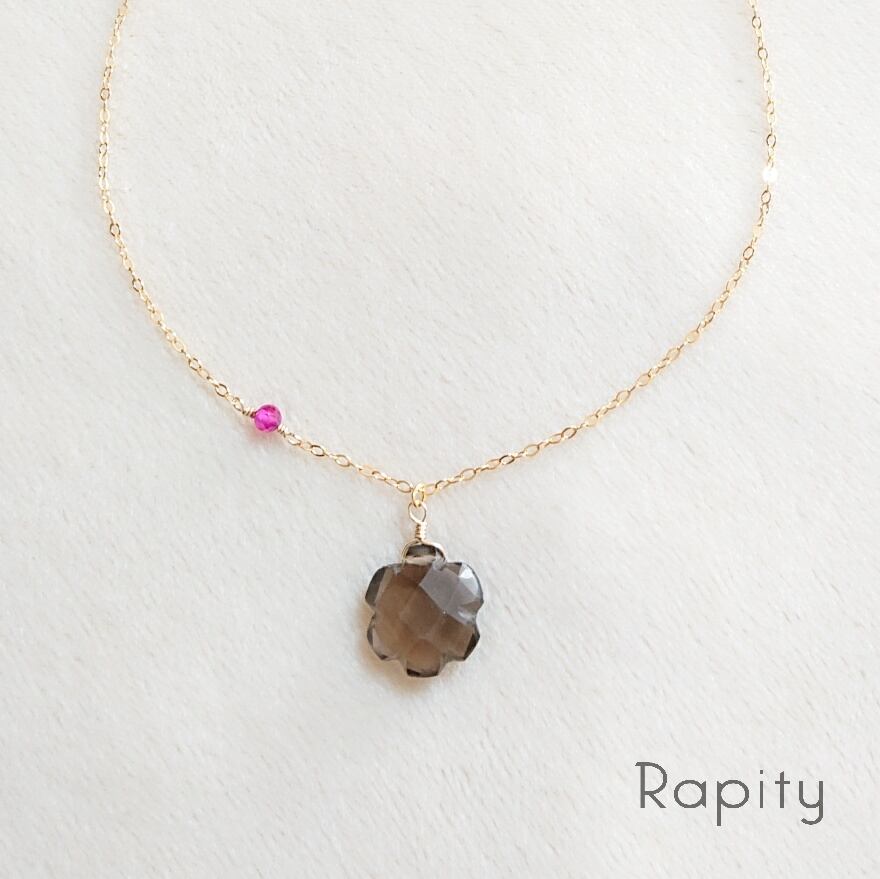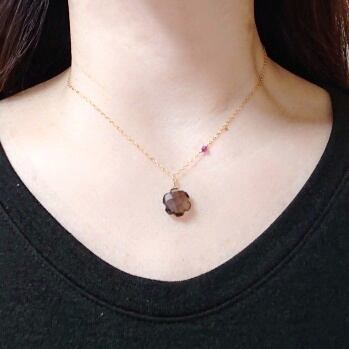 フラワー型のスモーキークォーツにアクセントとしてルビーを合わせたネックレスです。